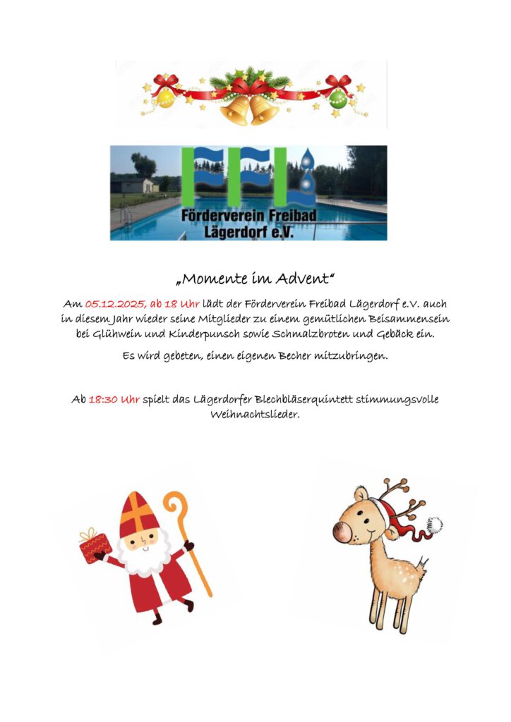 Liebe Mitglieder, liebe Freibad-Fans, am 05.12.2025, ab 18 Uhr lädt der Förderverein Freibad Lägerdorf e.V. auch in diesem Jahr wieder seine Mitglieder zu einem gemütlichen